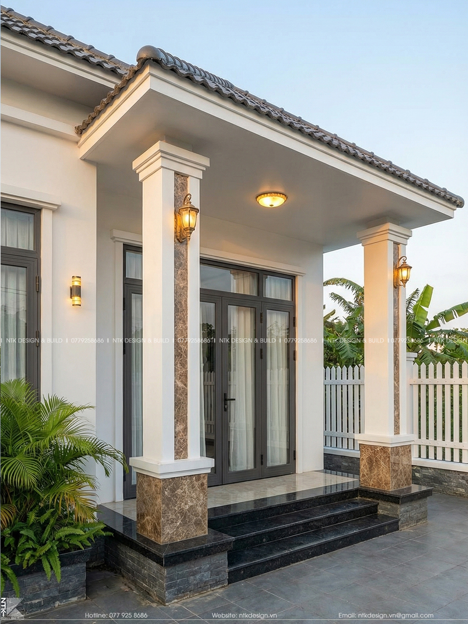 Hai cột trụ vuông kết hợp ốp đá tạo điểm nhấn vững chắc. Mái hiên phía trước vừa có chức năng che nắng mưa, vừa tạo chiều sâu cho mặt đứng.