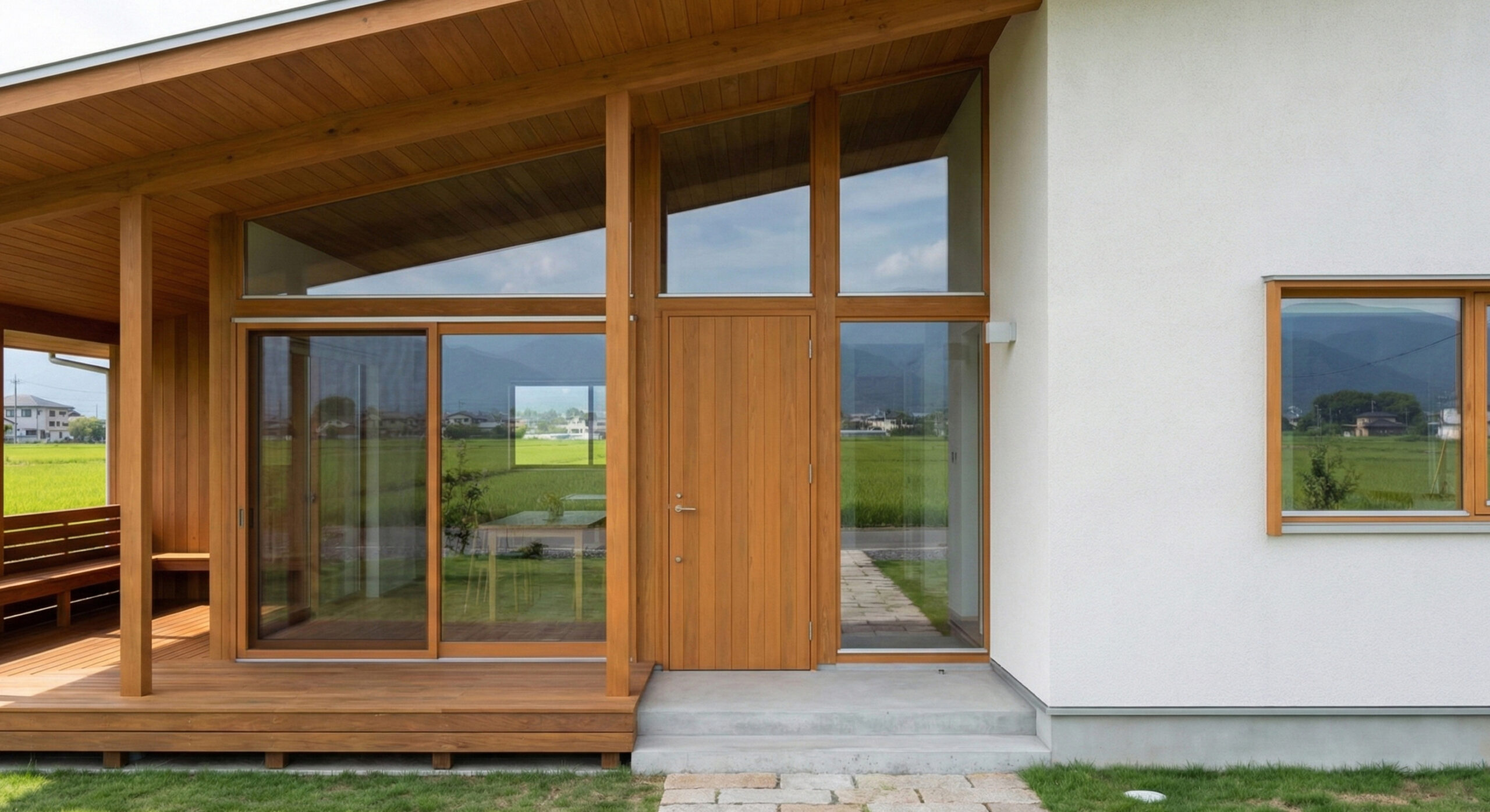 Điểm nổi bật của ngôi nhà chính là hệ cửa kính lớn mở ra hiên gỗ. Thiết kế này giúp tối ưu ánh sáng tự nhiên, đón gió trời và mở rộng tầm nhìn ra khung cảnh xanh mát bên ngoài. Chỉ cần mở cửa, thiên nhiên như tràn vào không gian sống.